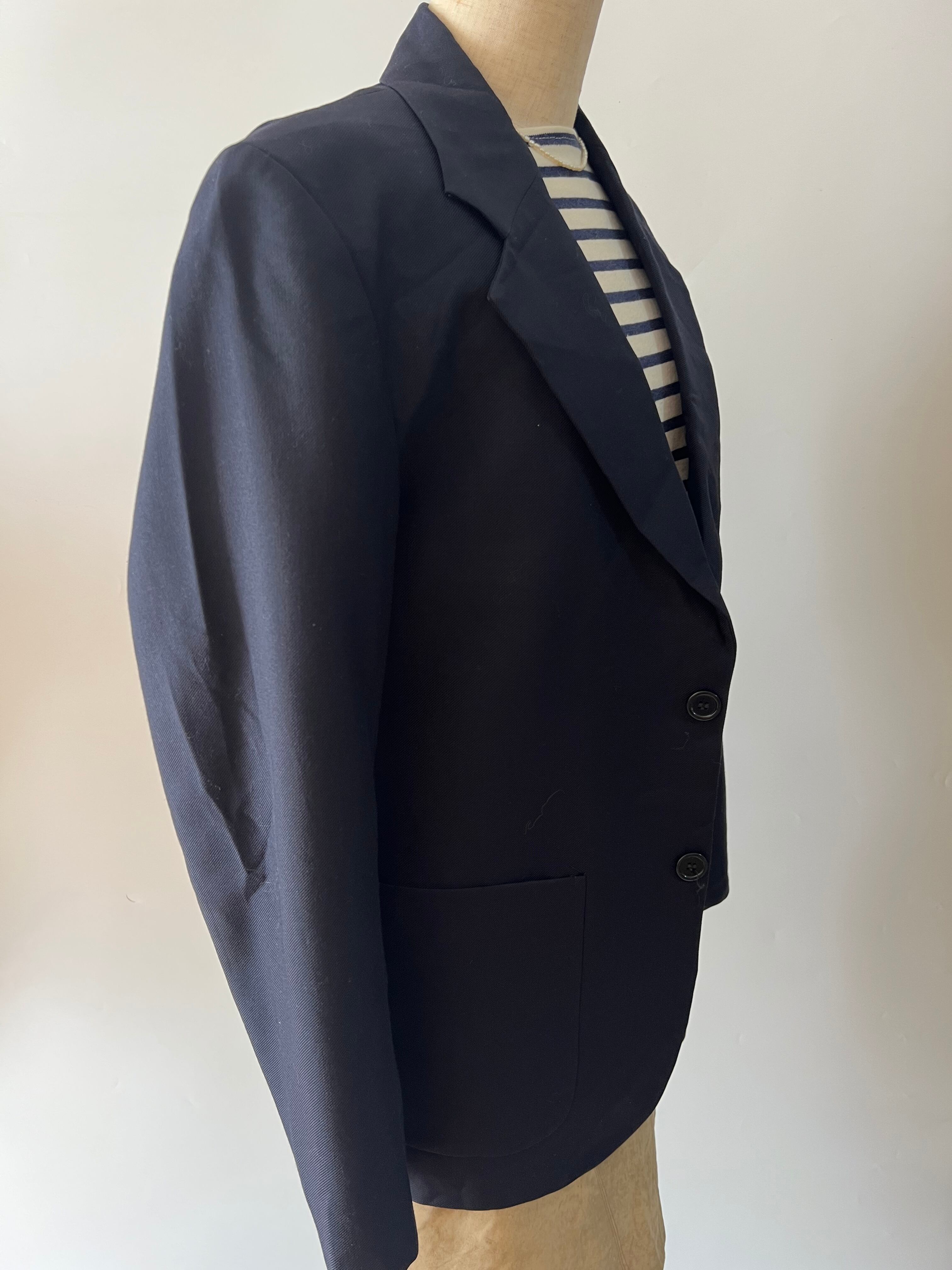 深いネイビー色のカレッジジャケット